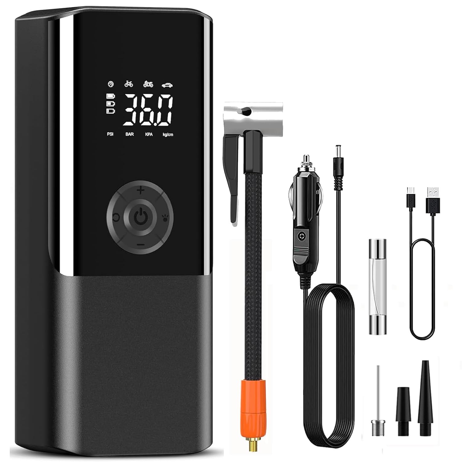 El Compresor Portátil está equipado con un chip de alto rendimiento que garantiza un inflado rápido y seguro. Además, Cuenta con cinco modos inteligentes preconfigurados para bicicleta, motocicleta, auto, balón y uno personalizable, con cuatro unidades de medida: PSI, KPA, BAR y KG.